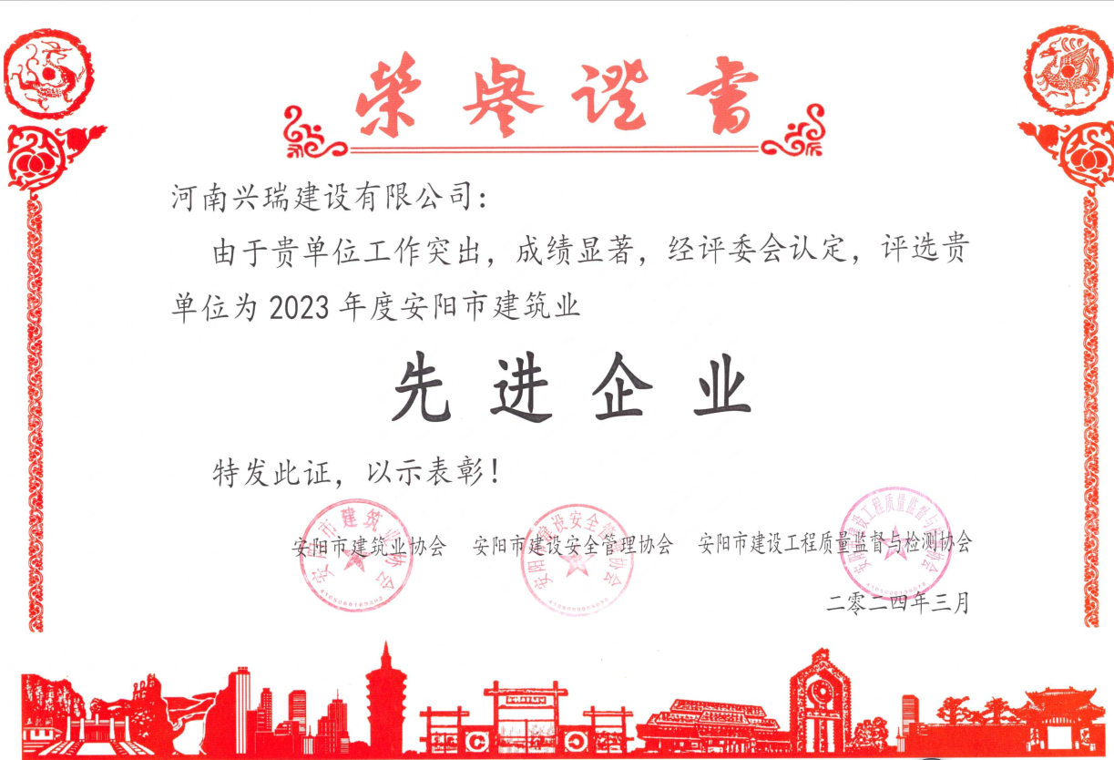 近日,安陽市建筑業(yè)協(xié)會對2023年度先進(jìn)企業(yè)和優(yōu) 秀項(xiàng)目經(jīng)理進(jìn)行了表彰,河南興瑞公司榮獲2023年度安陽市建筑業(yè)“先進(jìn)企業(yè)”和“安全管理先進(jìn)企業(yè)”,李振、郭計(jì)清、呂明潔、張玲玲等6人榮獲2023年度安陽市建筑業(yè)“優(yōu) 秀項(xiàng)目經(jīng)理”。