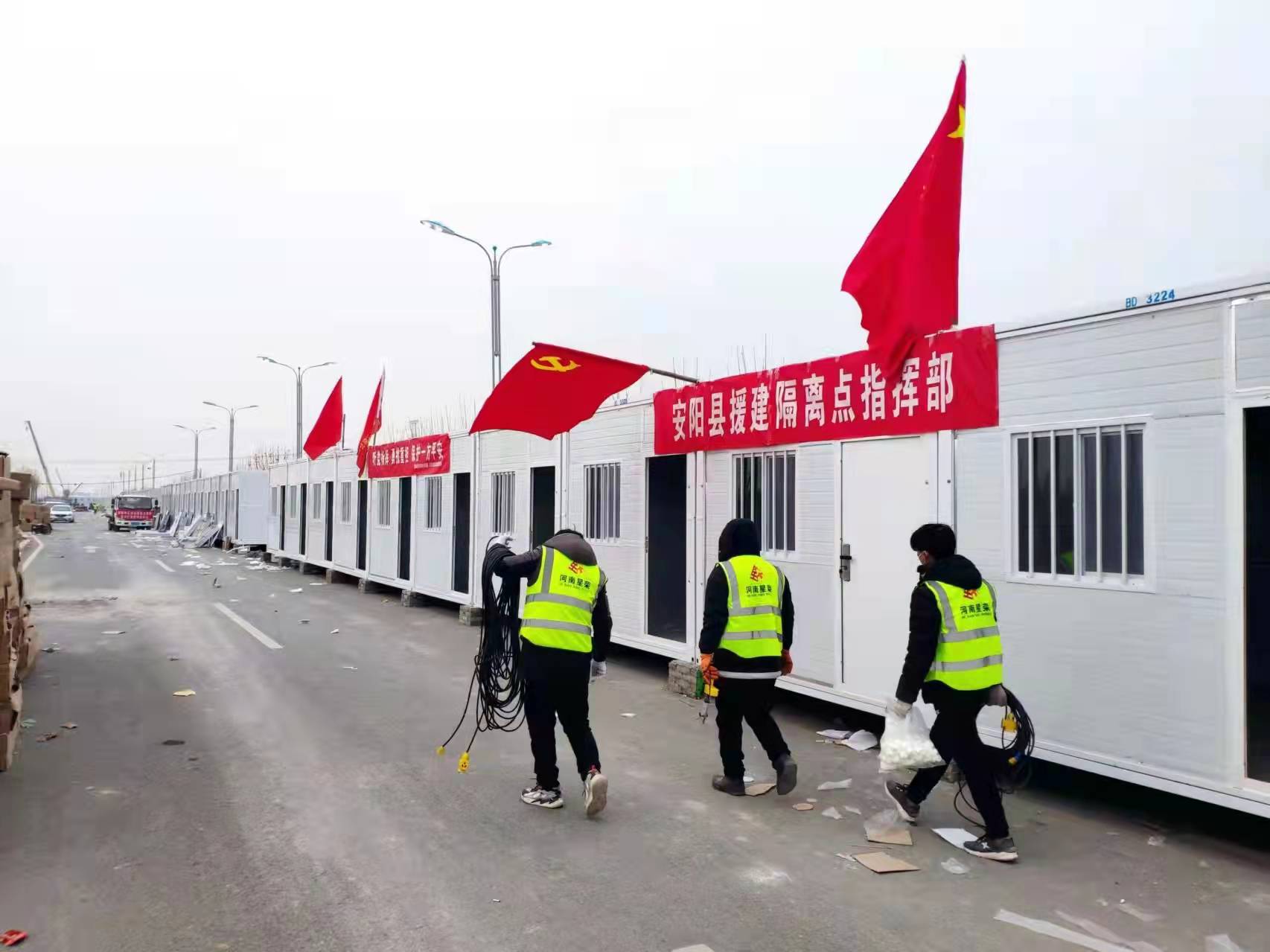 1月15日上午,安陽(yáng)縣住建局接到市疫情防控指揮部“援建方艙隔離點(diǎn)”的指示后,立即召開(kāi)緊急會(huì)議,統(tǒng)籌協(xié)調(diào)組織實(shí)施力量,黨組書記、局長(zhǎng)米永建,副局長(zhǎng)汪宏杰現(xiàn)場(chǎng)督“戰(zhàn)”,現(xiàn)場(chǎng)一線辦公,現(xiàn)場(chǎng)指揮、通宵作戰(zhàn),協(xié)調(diào)采購(gòu)、運(yùn)輸、安裝設(shè)備、配件等。星榮、興瑞兩家企業(yè)分批調(diào)集人員投入防控隔離點(diǎn)建設(shè)、設(shè)備安裝等工作中?!拔覀兒托菢s公司負(fù)責(zé)新建364間的隔離房,開(kāi)工到交付只有一星期時(shí)間,我們必須克服一切困難按時(shí)交付?!焙幽吓d瑞公司董事長(zhǎng)牛敬堂說(shuō)?!斑@是政府對(duì)公司的信任,也是我們的責(zé)任,務(wù)必千方百計(jì)完成這一光榮任務(wù)。”河南星榮公司總經(jīng)理申偉鏗鏘有力的說(shuō)到。